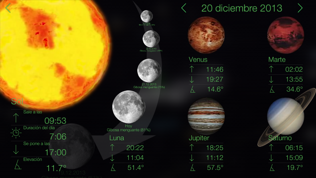• A scale on right is the Time Machine, slide it to investigate the guide of the night sky of tomorrow or years back.