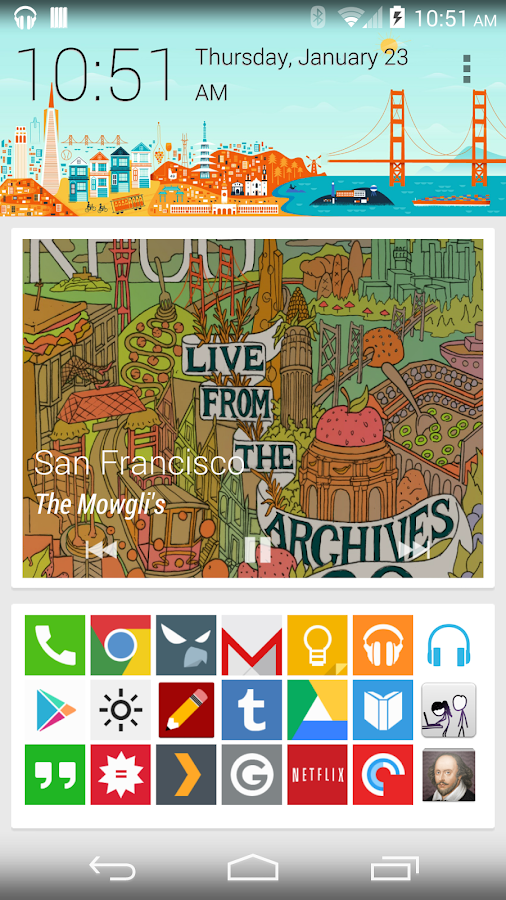 The top area of the launcher is a header with the time, date, and a realistic of a the San Francisco horizon from Google Now. This picture progressions dependent upon the time of day. You can design at what times the pictures change from header settings. There are currently eleven headers accessible in addition to configurable tap and long press alternatives for the clock and the header picture. You can likewise shrivel the stature of this header.